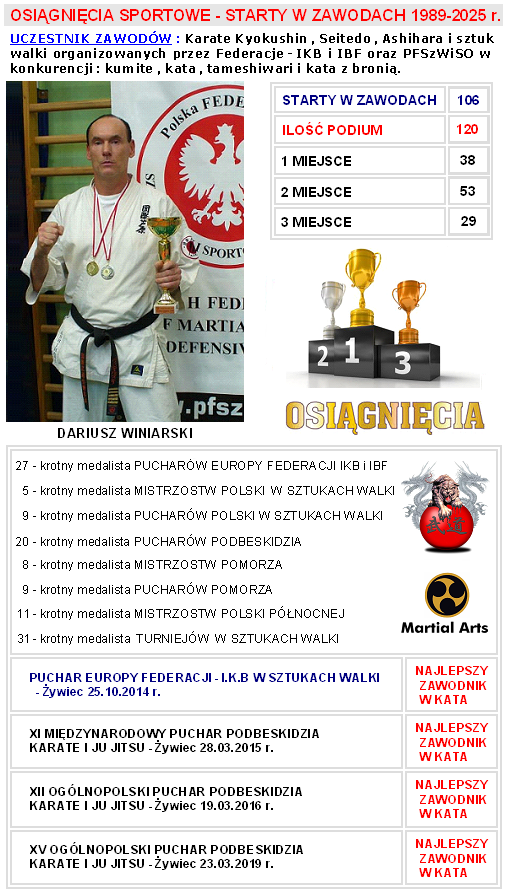 Trenując sztuki walki od 1980 r. Dariusz Winiarski miał okazję uczestniczyć w wielu szkoleniach i obozach Karate, Ju Jitsu, Kick-Boxing i Kobudo w Polsce i zagranicą. Trenował pod kierunkiem bardzo wielu znanych zagranicznych mistrzów sztuk walki: