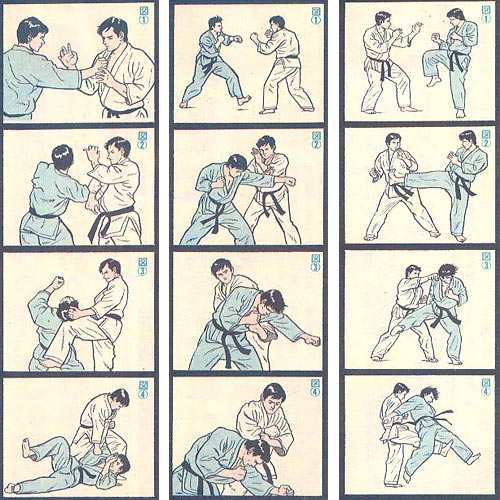 skorzystał z wielu technik tej dyscypliny, jak na przykład chwyty za karategi